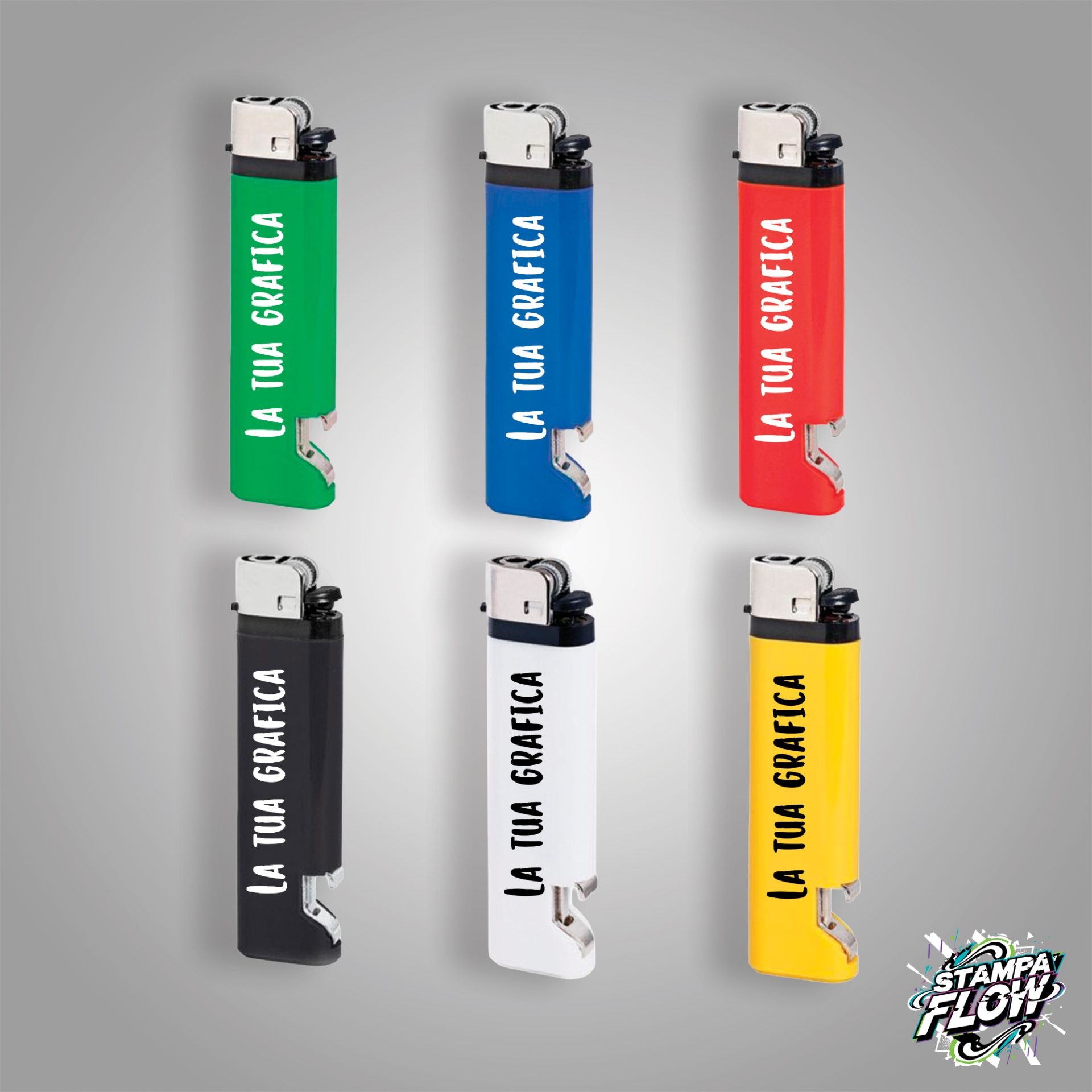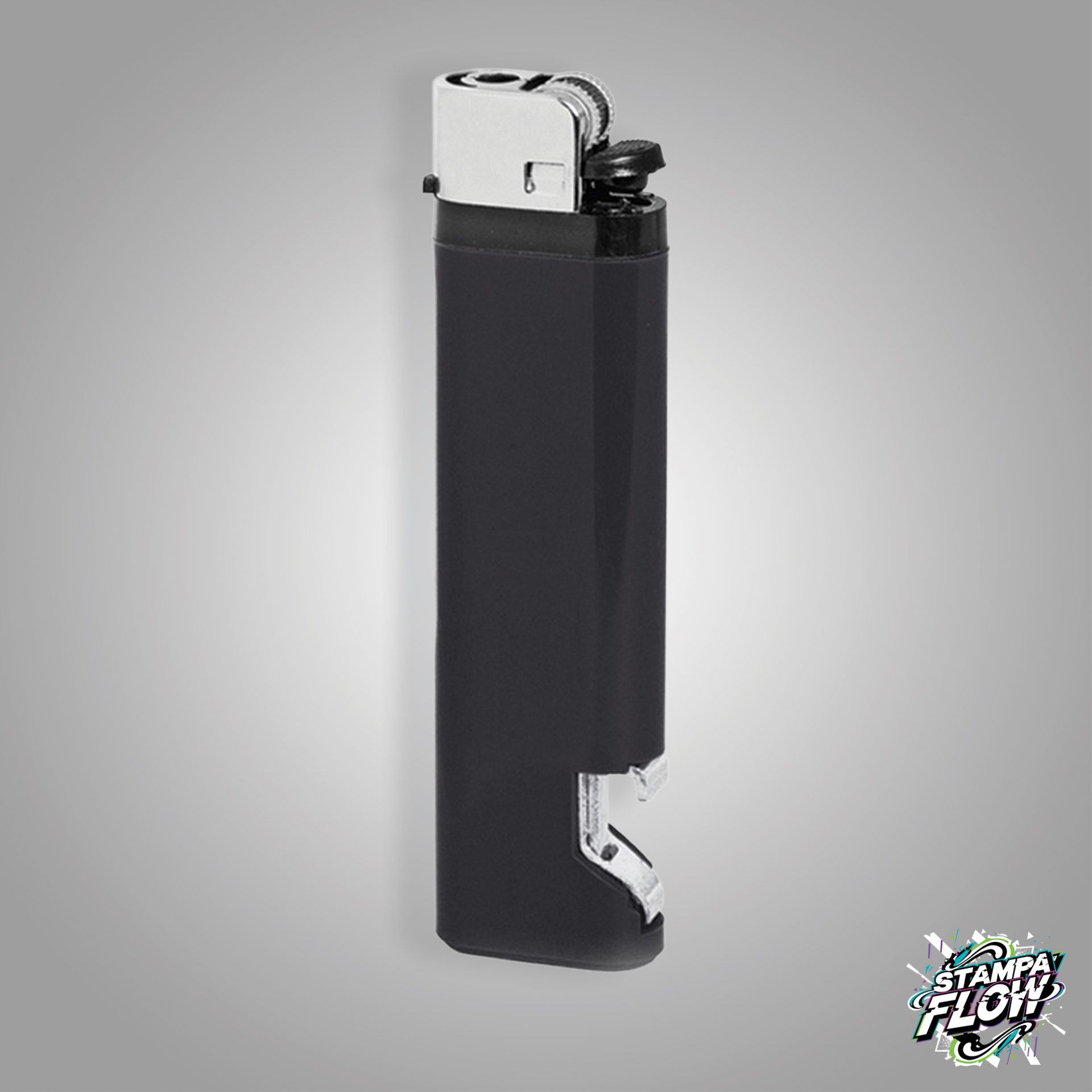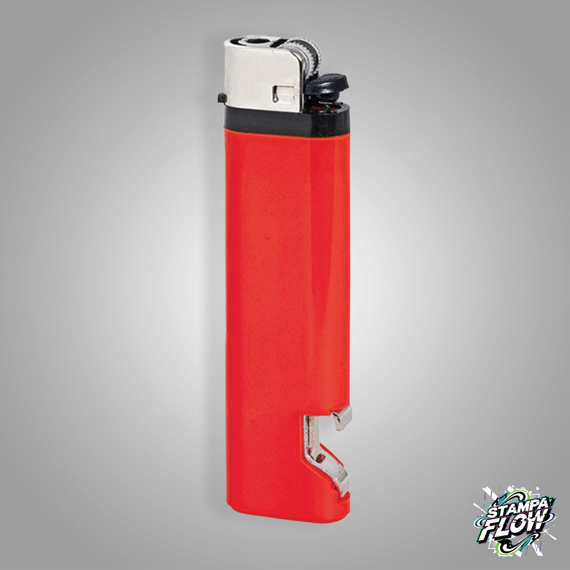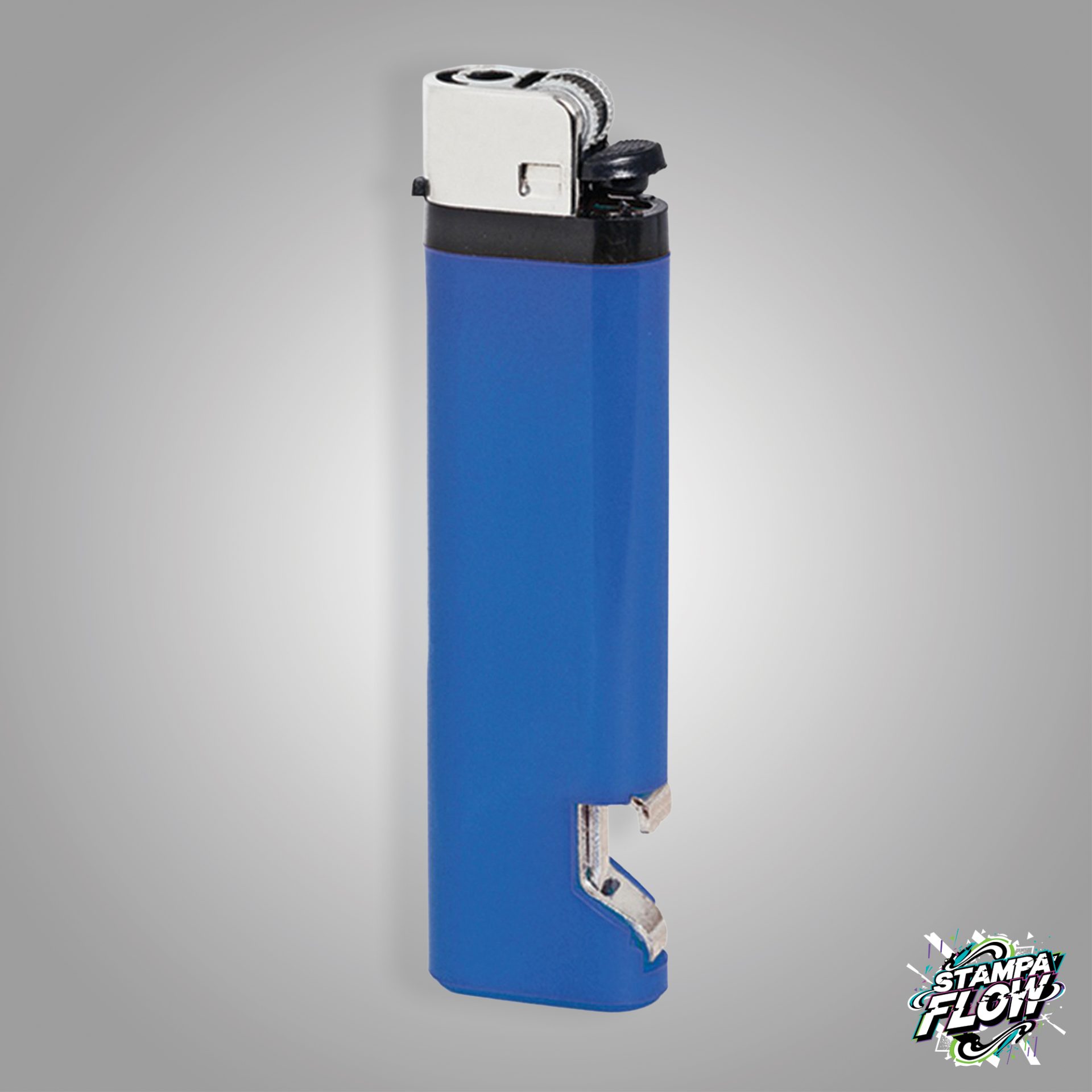 Accendino apribottiglie, pietra focaia. Plastica. Colori: bianco, nero, giallo, blu, verde, rosso. Dimensioni: cm 2,4x9x0,9
