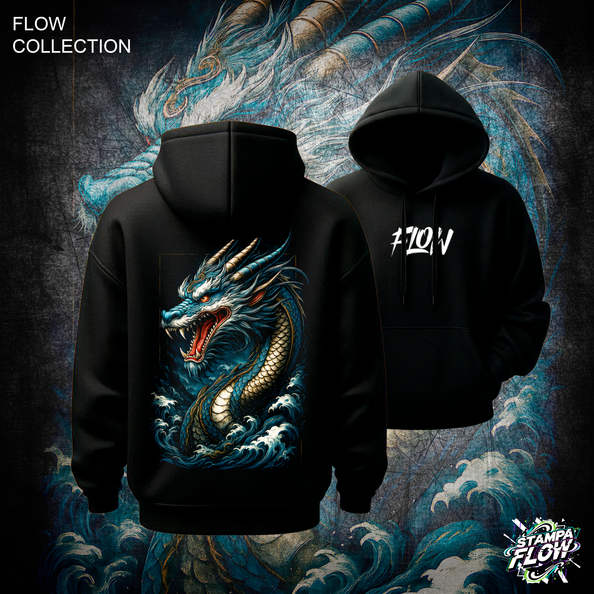 Questa felpa incarna la potenza inarrestabile e maestosa degli oceani. La stampa posteriore presenta un fiero drago asiatico dalle squame blu cobalto e dorate, che emerge ruggendo da un vortice di onde spumeggianti. Il design, elegantemente incorniciato da un sottile bordo che richiama le antiche stampe giapponesi, unisce la fluidità del mito alla forza dell’abbigliamento urban. Perfetta per chi vuole dominare il proprio stile con un’energia pura e travolgente. Sul petto, il logo FLOW firma il capo.