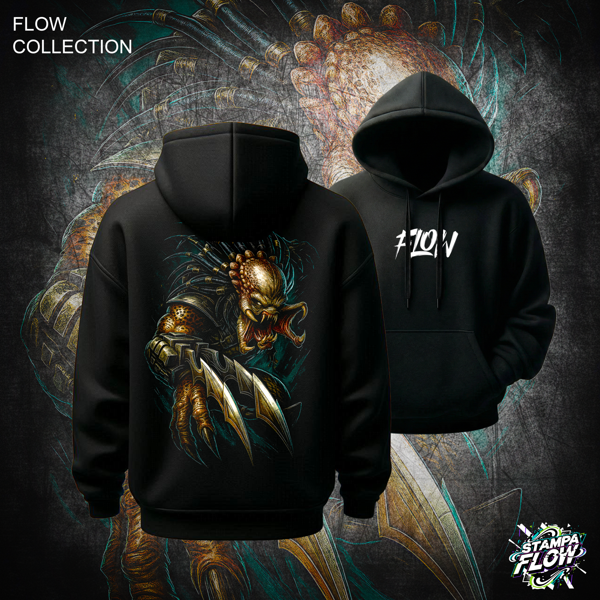 Questa felpa scatena l’istinto del cacciatore supremo della galassia: Predator. La stampa posteriore è letale e dettagliata: ritrae lo Yautja con le fauci spalancate e le iconiche lame da polso sguainate, arricchite da riflessi oro e bronzo che creano un effetto metallico pazzesco sul tessuto scuro. Sul petto, il logo FLOW firma il capo.
