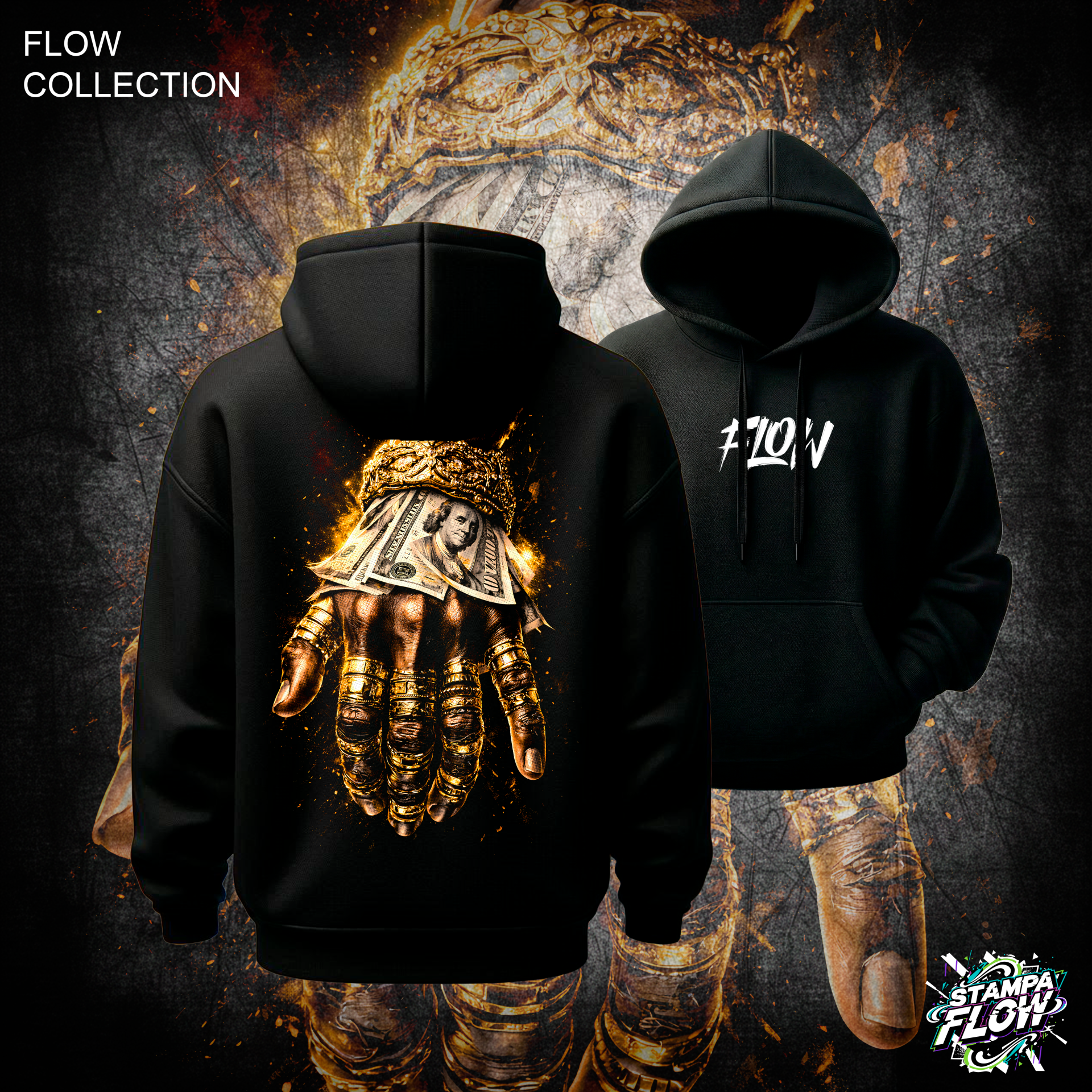 Questa felpa è una dichiarazione di potere e successo senza compromessi. La stampa posteriore è un trionfo di dettagli e opulenza: una mano imponente, carica di pesanti anelli dorati e bracciali incisi, stringe con forza una mazzetta di banconote da cento dollari. I riflessi metallici, le scintille calde e l’effetto “texture consumata” creano un design dal forte sapore urban e hip-hop, che spicca prepotentemente sul nero assoluto del tessuto. Un capo dal fit boxy strutturato, perfetto per chi non ha paura di mostrare la propria determinazione. Sul petto, il logo FLOW firma il capo.