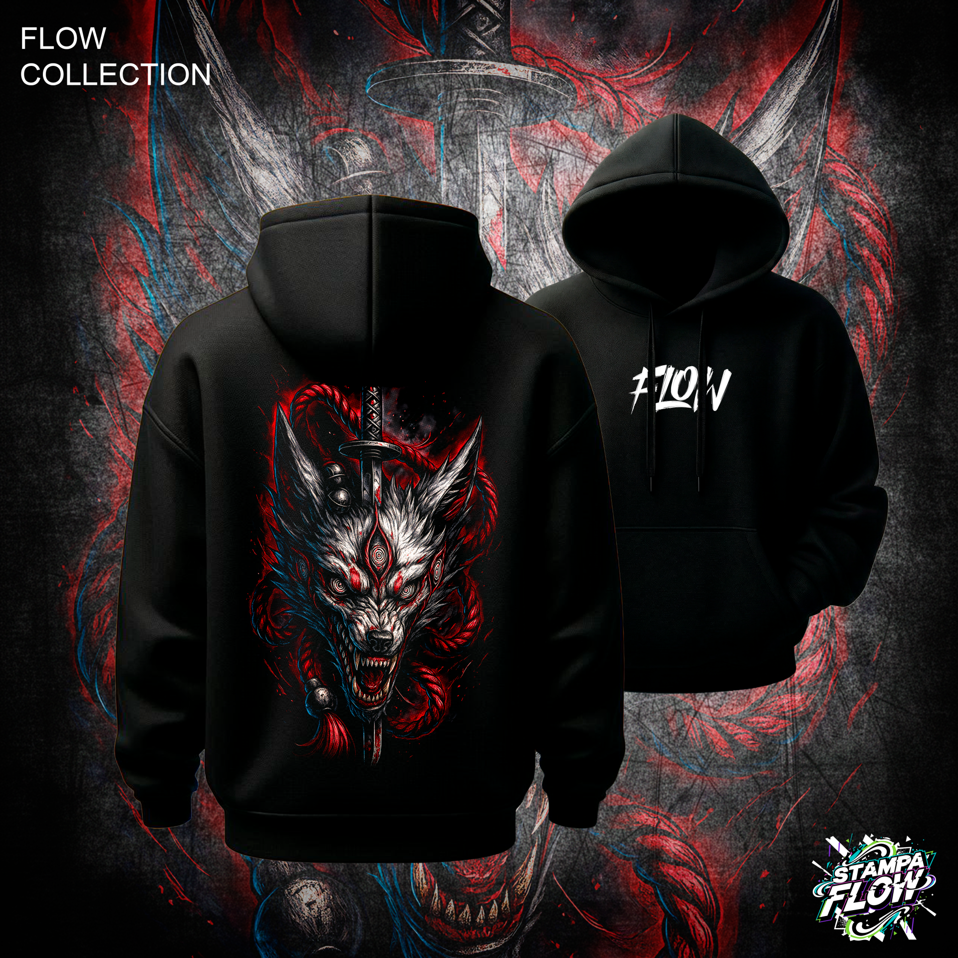 Questa felpa sprigiona una ferocia inarrestabile. La stampa posteriore è dominata dal muso ringhiante di un lupo demoniaco (Okami), caratterizzato da tre occhi penetranti rosso sangue. Una spada tradizionale lo trafigge, mentre pesanti corde scarlatte (shimenawa) si intrecciano attorno a lui in un mistico rituale. Un capo dal design brutale, complesso e dal forte sapore dark fantasy, perfetto per chi vuole imporre il proprio stile con aggressività. Sul petto, il logo FLOW firma il capo.