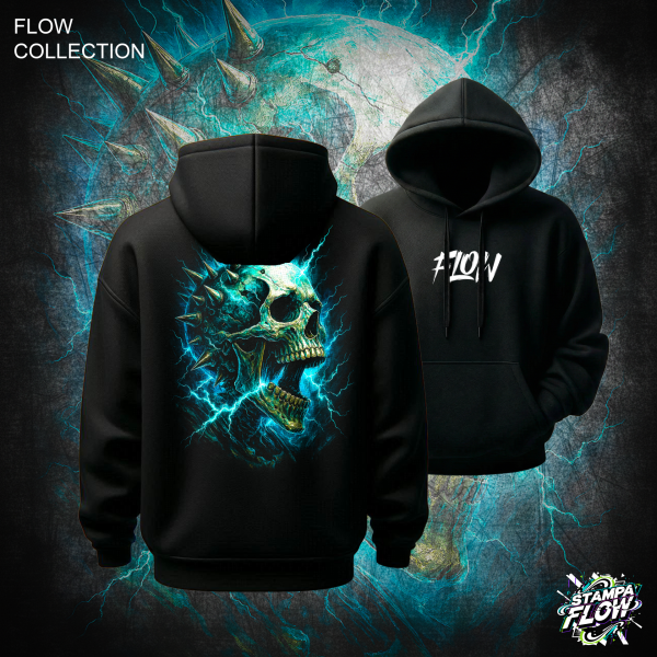 Questa felpa impone la sua presenza con una grafica brutale e magnetica. La stampa posteriore ritrae un teschio “spiked” in stile punk, squarciato da scariche elettriche ciano e riflessi verde acido che sembrano illuminarsi sul tessuto nero. Un design potente, pensato per chi vuole un look aggressivo e carico di elettricità urbana. Sul petto, il logo FLOW firma il capo.