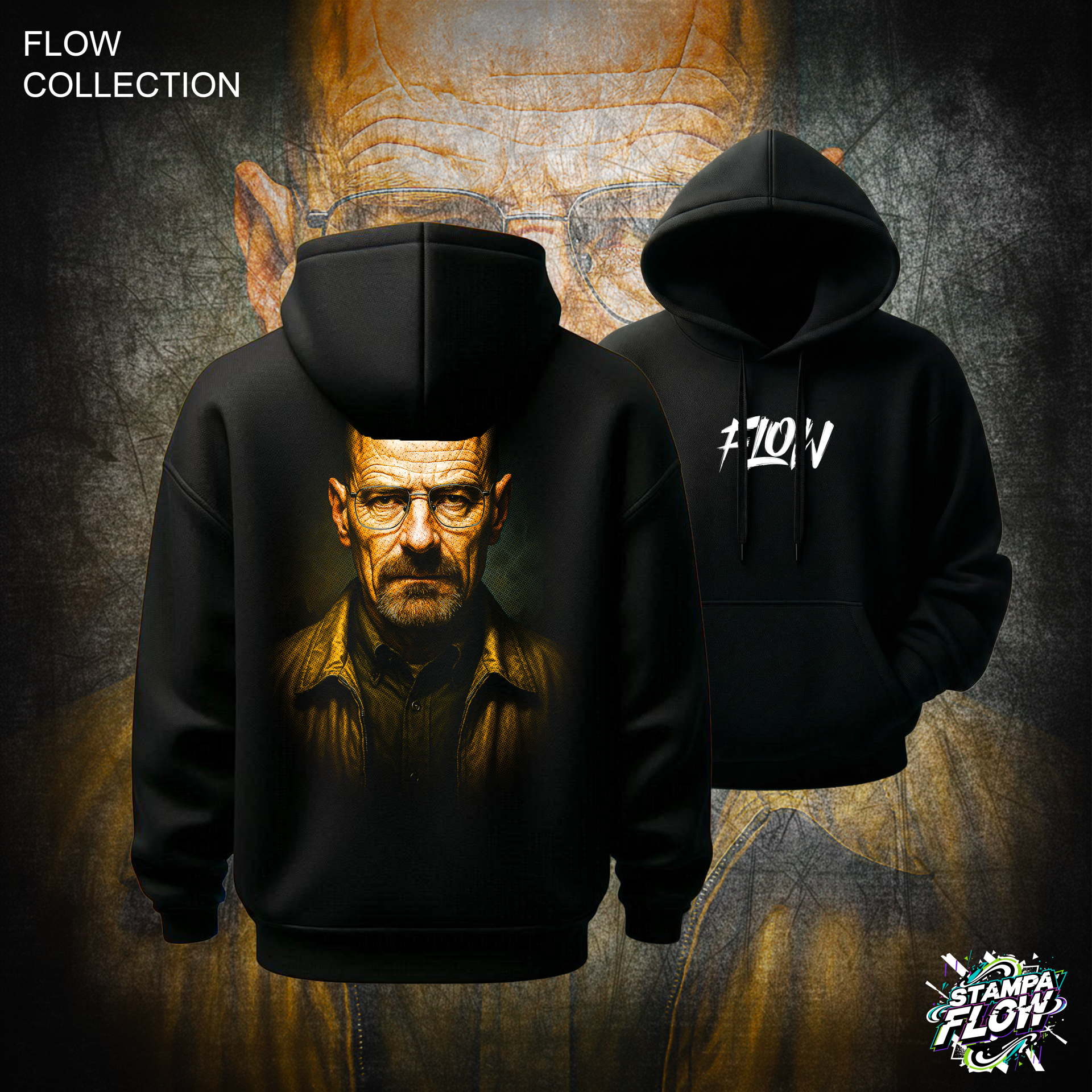 Questa felpa impone rispetto con la presenza scenica di Walter White, alias Heisenberg. La stampa posteriore è un ritratto intenso e dettagliato del professore diventato boss, con il suo iconico sguardo dietro gli occhiali e un’illuminazione dorata che simboleggia la sua ascesa e caduta imperiale. Sul petto, il logo FLOW firma il capo.