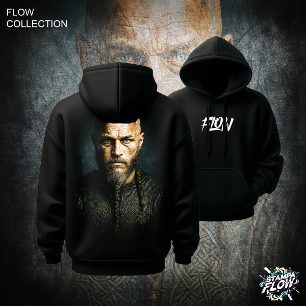 Questa felpa è un tributo al vichingo più leggendario di sempre: Ragnar Lothbrok. La stampa posteriore è ipnotica: il volto di Ragnar emerge dal buio con un realismo crudo, mettendo in risalto i suoi iconici occhi di ghiaccio e la barba intrecciata, simbolo di potere e saggezza guerriera. Sul petto, il logo FLOW firma il capo.
