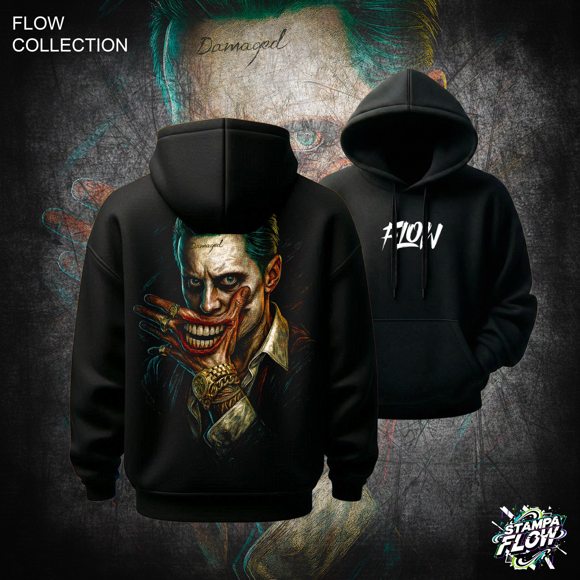 Questa felpa celebra la versione più gangster e psicotica del Principe del Crimine: il Joker di Suicide Squad. La stampa posteriore è un concentrato di follia: ritrae il volto pallido del villain con i capelli verde neon e il celebre tatuaggio del sorriso sulla mano, arricchito da gioielli d’oro che risaltano prepotentemente sul tessuto scuro. Sul petto, il logo FLOW firma il capo.