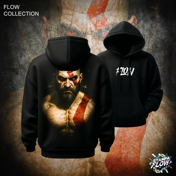 Questa felpa incarna la furia e la determinazione del protagonista di una delle saghe più epiche di sempre: Kratos. La stampa posteriore è un ritratto iper-dettagliato del Fantasma di Sparta. Il rosso acceso del suo tatuaggio e il bagliore cremisi dei suoi occhi “tagliano” l’oscurità del fondo nero, trasmettendo tutta la forza del personaggio. Sul petto, il logo FLOW firma il capo con uno stile deciso.
