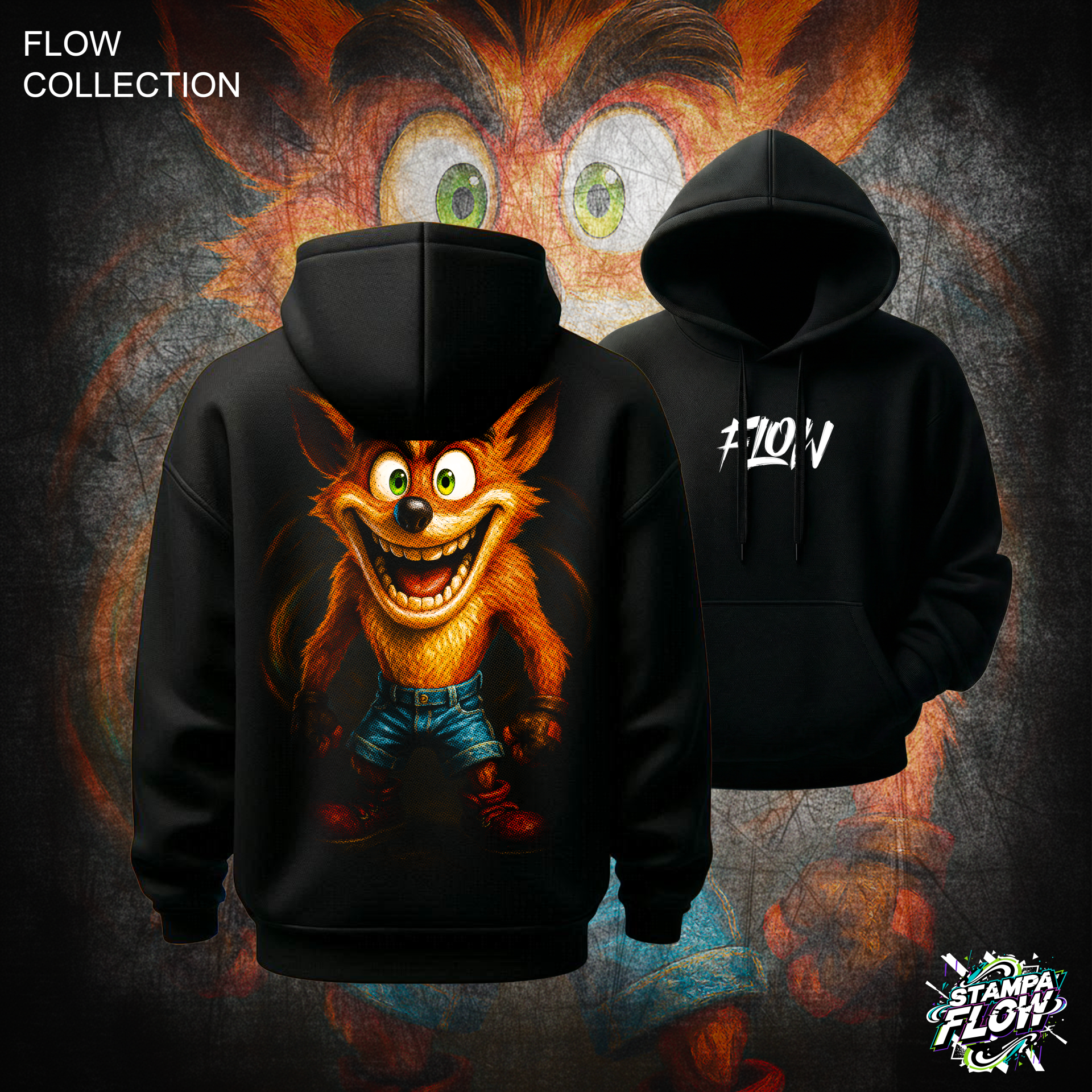 Questa felpa è un concentrato di pura follia e nostalgia: Crash Bandicoot. La stampa posteriore cattura l’energia incontenibile del marsupiale più famoso dei videogiochi, con il suo inconfondibile sorriso a 32 denti e lo sguardo “fuori di testa”. Il colore arancione acceso del pelo risalta in modo spettacolare sul tessuto scuro. Sul petto, il logo FLOW firma il capo.