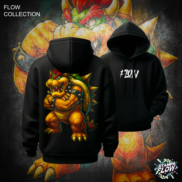 Questa felpa è dedicata al Re dei Koopa: Bowser. La stampa posteriore è imponente e ricca di dettagli artistici in stile “sketch”, dove la possanza del villain di Super Mario viene esaltata da sfumature arancioni e verdi vibranti che dominano il fondo scuro. Sul petto, il logo FLOW firma il capo.