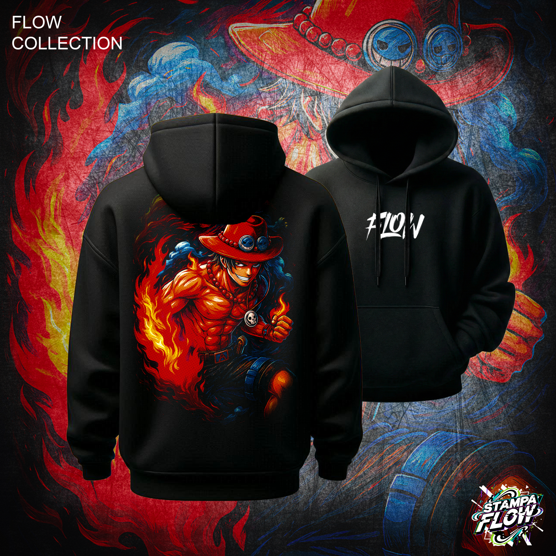 Questa felpa è un tributo infuocato a uno dei personaggi più amati della Rotta Maggiore: Portgas D. Ace. La stampa posteriore cattura “Pugno di Fuoco” in tutto il suo carisma, avvolto da fiamme vibranti che si accendono letteralmente sul tessuto scuro. I dettagli del suo iconico cappello e l’intensità dello sguardo rendono questa grafica un vero capolavoro per ogni vero pirata. Sul petto, il logo FLOW firma il capo con un tocco pulito ed essenziale.