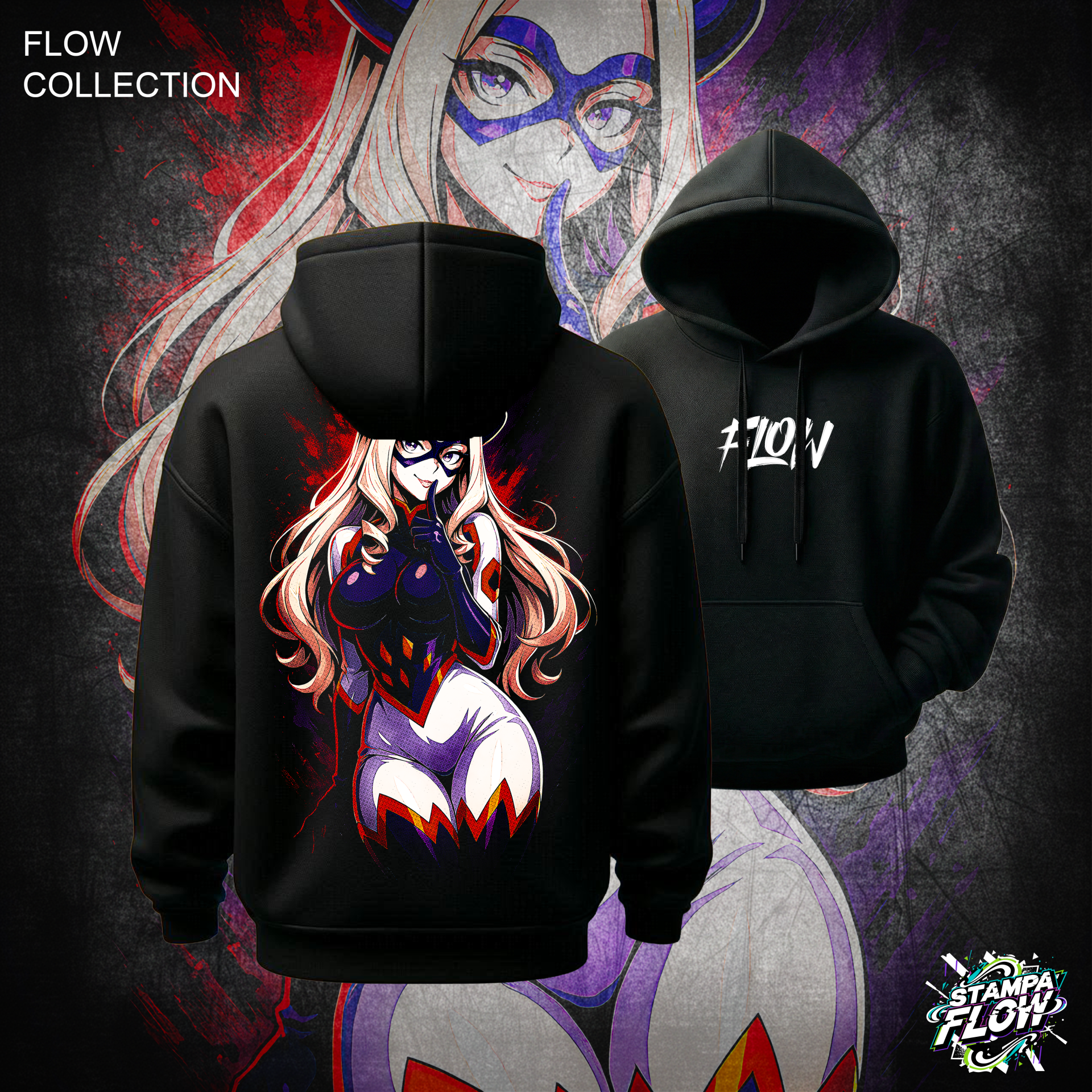 Questa felpa è dedicata alla Pro Hero numero uno in fatto di stile: Mt. Lady. La stampa posteriore ritrae l’eroina capace di gigantificarsi con il suo inconfondibile costume viola e crema, creando un contrasto magnetico sul fondo scuro. Sul petto, il logo FLOW firma il capo in modo essenziale.