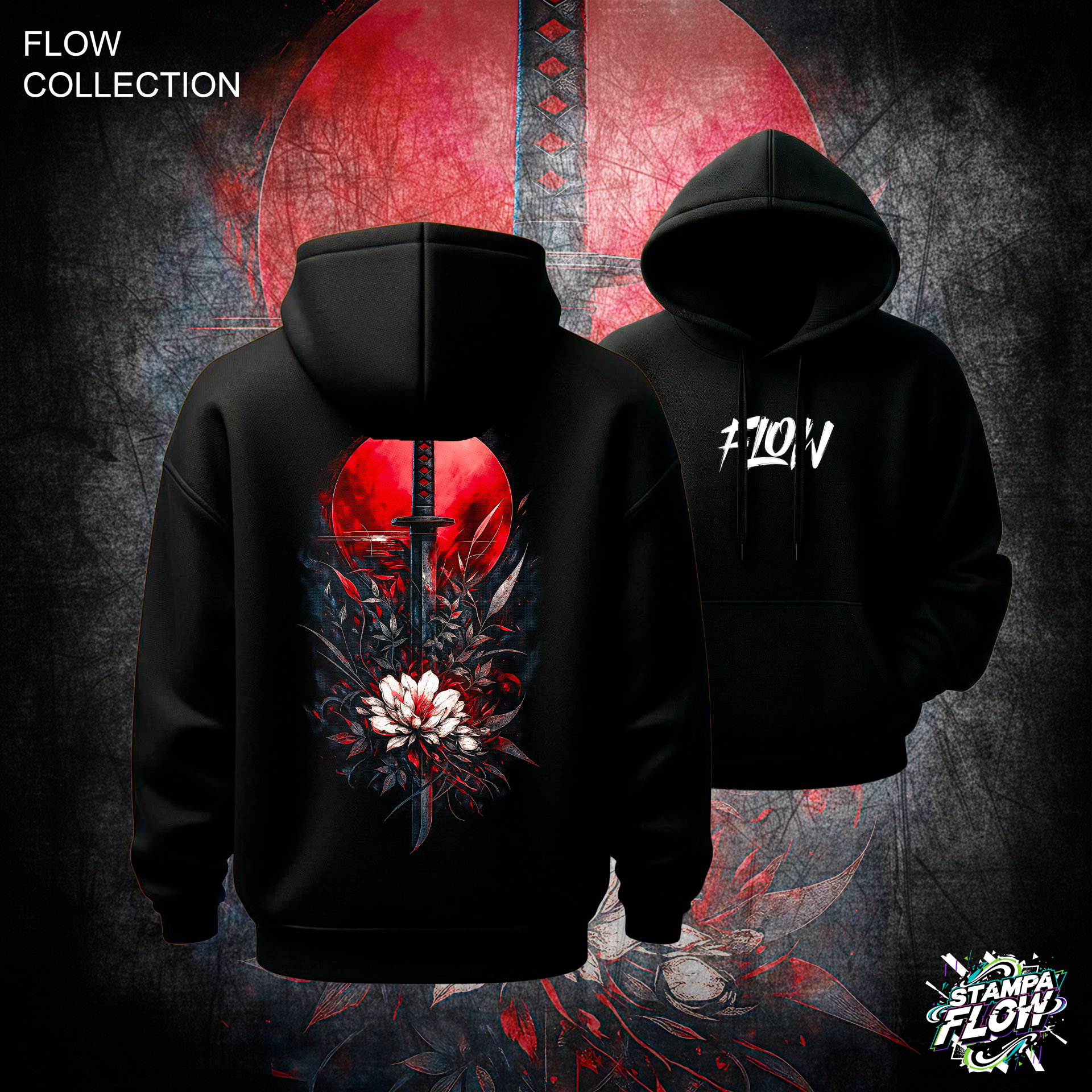 Questa felpa è una dichiarazione di equilibrio e forza interiore. La stampa posteriore è un’opera d’arte minimalista e profonda: una katana, simbolo di onore e risolutezza, trafigge delicatamente un fiore bianco, stagliandosi contro un intenso sole rosso sangue. Il contrasto tra la freddezza dell’acciaio, la delicatezza della natura e l’intensità dello sfondo crea un capo dal design sofisticato e ricco di significato, perfetto per chi affronta la vita con fermezza e consapevolezza. Sul petto, il logo FLOW firma il capo.