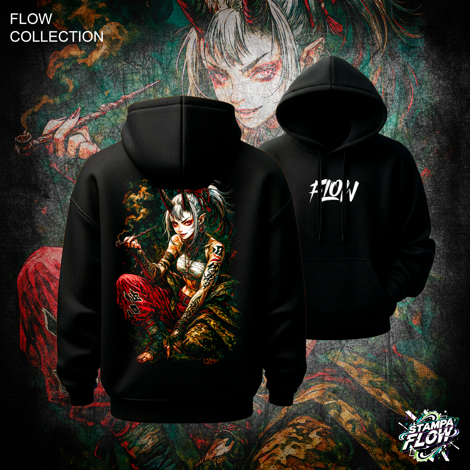 La Flow Collection porta le antiche leggende orientali nel tuo stile streetwear. Questa felpa è l’essenza della ribellione in stile manga dark. La stampa posteriore ritrae una seducente e pericolosa ragazza demone (Oni) dai capelli bianchi e corna scarlatte, avvolta dal fumo di un tradizionale kiseru. I tatuaggi intricati, le bende e l’abbigliamento urban-samurai creano un’estetica punk-orientale dal fascino irresistibile. Un capo magnetico, perfetto per chi cerca un look audace, sfrontato e curato in ogni dettaglio. Sul petto, il logo FLOW firma il capo.