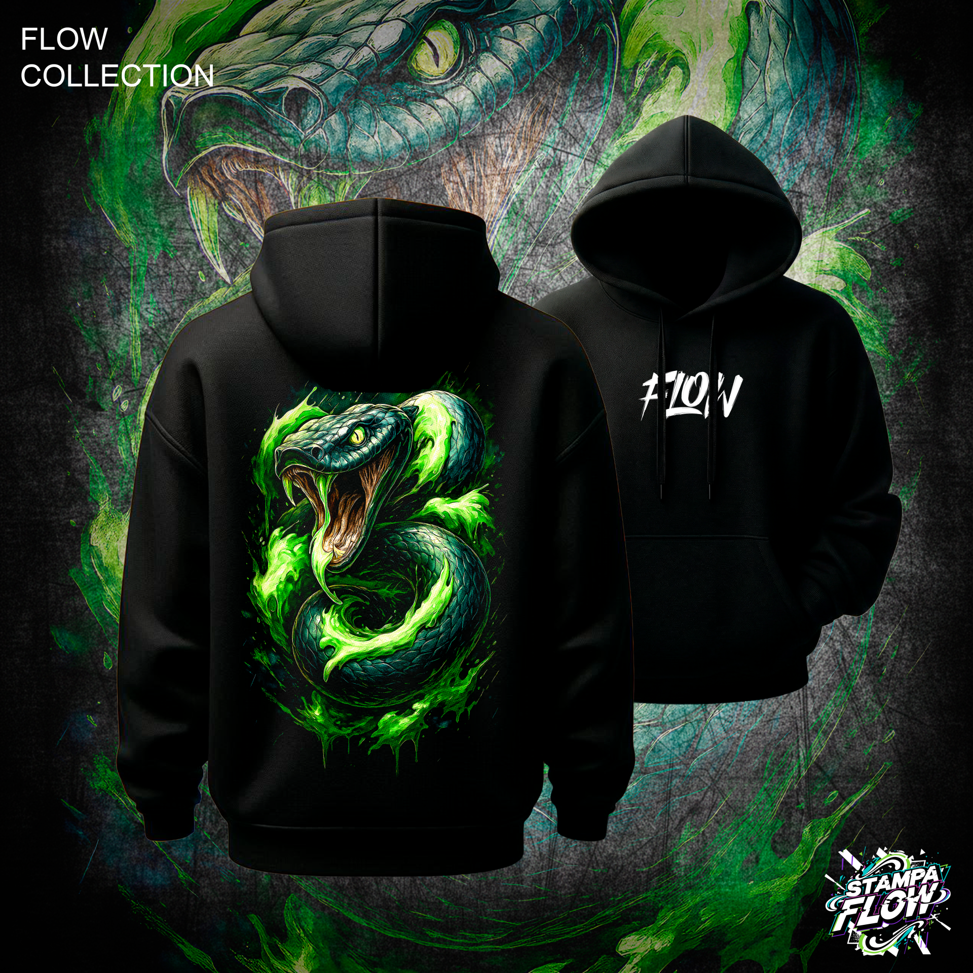 Questa felpa sprigiona un’attitudine letale e ipnotica. La stampa posteriore è dominata da un serpente maestoso e minaccioso, le cui squame iper-dettagliate si fondono con scie di fumo ed energia verde neon dall’effetto quasi “tossico”. Un design aggressivo, fluido e profondamente magnetico, pensato per chi vuole dominare l’ambiente urbano con uno stile tagliente e inconfondibile. Sul petto, il logo FLOW firma il capo.