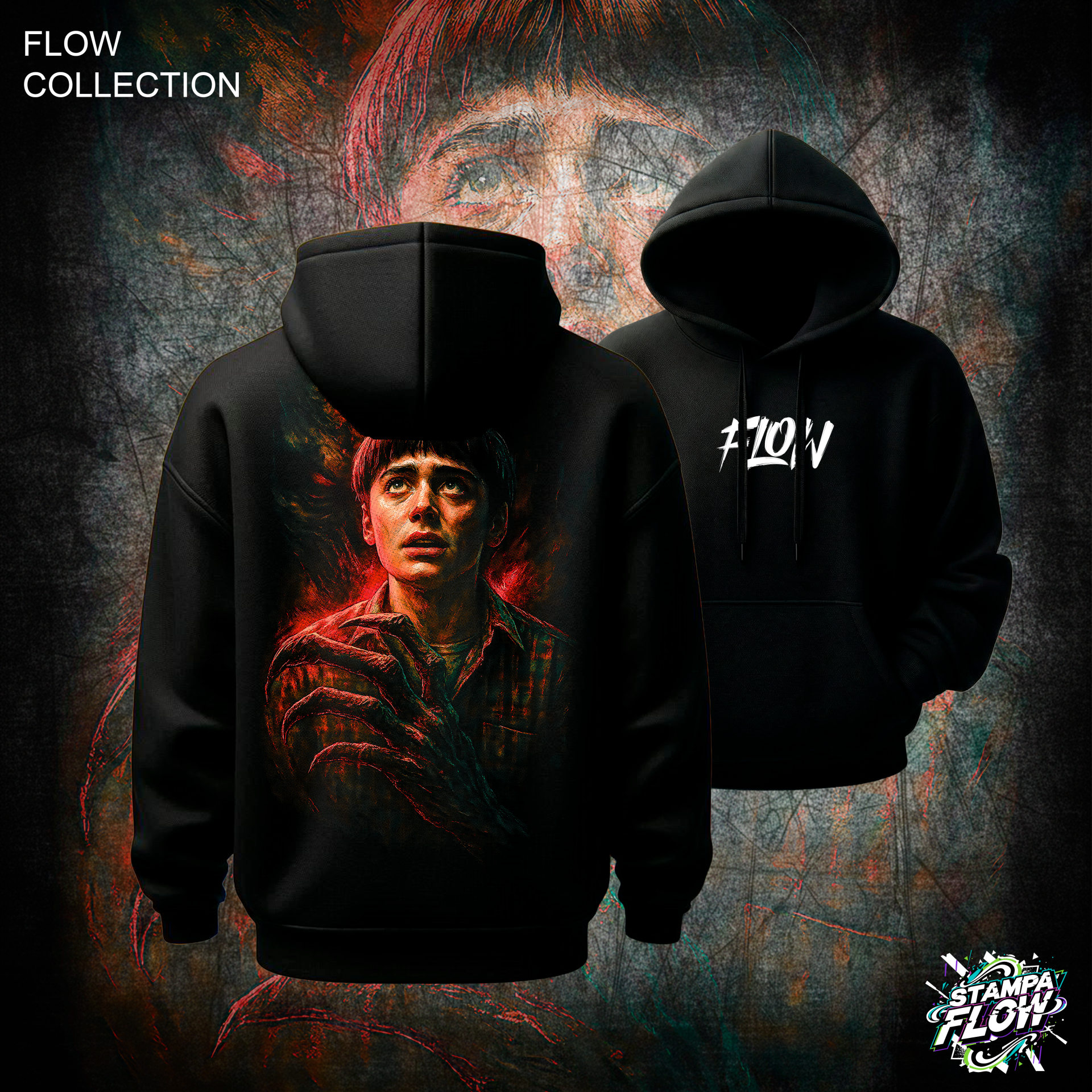 Questa felpa cattura l’essenza della suspense e del terrore puro. La stampa posteriore immortala il giovane protagonista con lo sguardo perso nella paura, mentre un artiglio mostruoso emerge dall’oscurità per stringerlo. I toni cupi e i bagliori rosso sangue ricreano l’atmosfera opprimente delle dimensioni parallele, dando vita a un capo dark, intenso e dal forte impatto narrativo. Sul petto, il logo FLOW firma il capo.