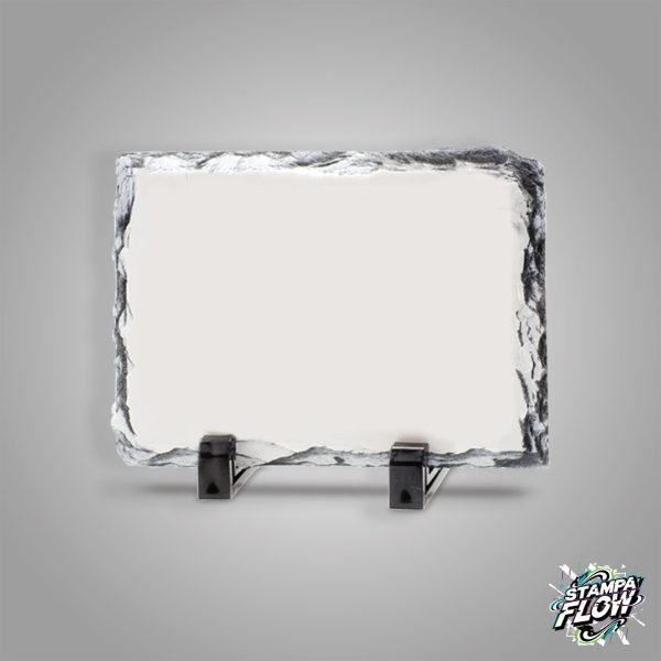 Pietra in ardesia naturale rettangolare, caratterizzata da bordi irregolari e scalpellati che rendono ogni pezzo unico. La superficie frontale è trattata con una speciale finitura bianca lucida, studiata per esaltare la brillantezza dei colori e la profondità dei neri nelle fotografie. Il prodotto viene fornito completo di due supporti in plastica rigida nera per l’esposizione da tavolo. Perfetta come complemento d’arredo originale o come regalo di pregio che trasforma una semplice foto in un oggetto di design solido e duraturo.