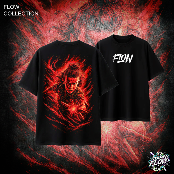 Questa T-shirt cattura il fascino del soprannaturale con una maxi-grafica posteriore ad altissima tensione. Lo sguardo determinato e l’energia telecinetica rossa che esplode dalle mani della protagonista creano un impatto cromatico pazzesco sul nero profondo del cotone pesante. Un capo dal design iconico e vibrante, pensato per chi vuole farsi notare indossando un vero cult moderno. Sul petto, il logo FLOW completa il design.