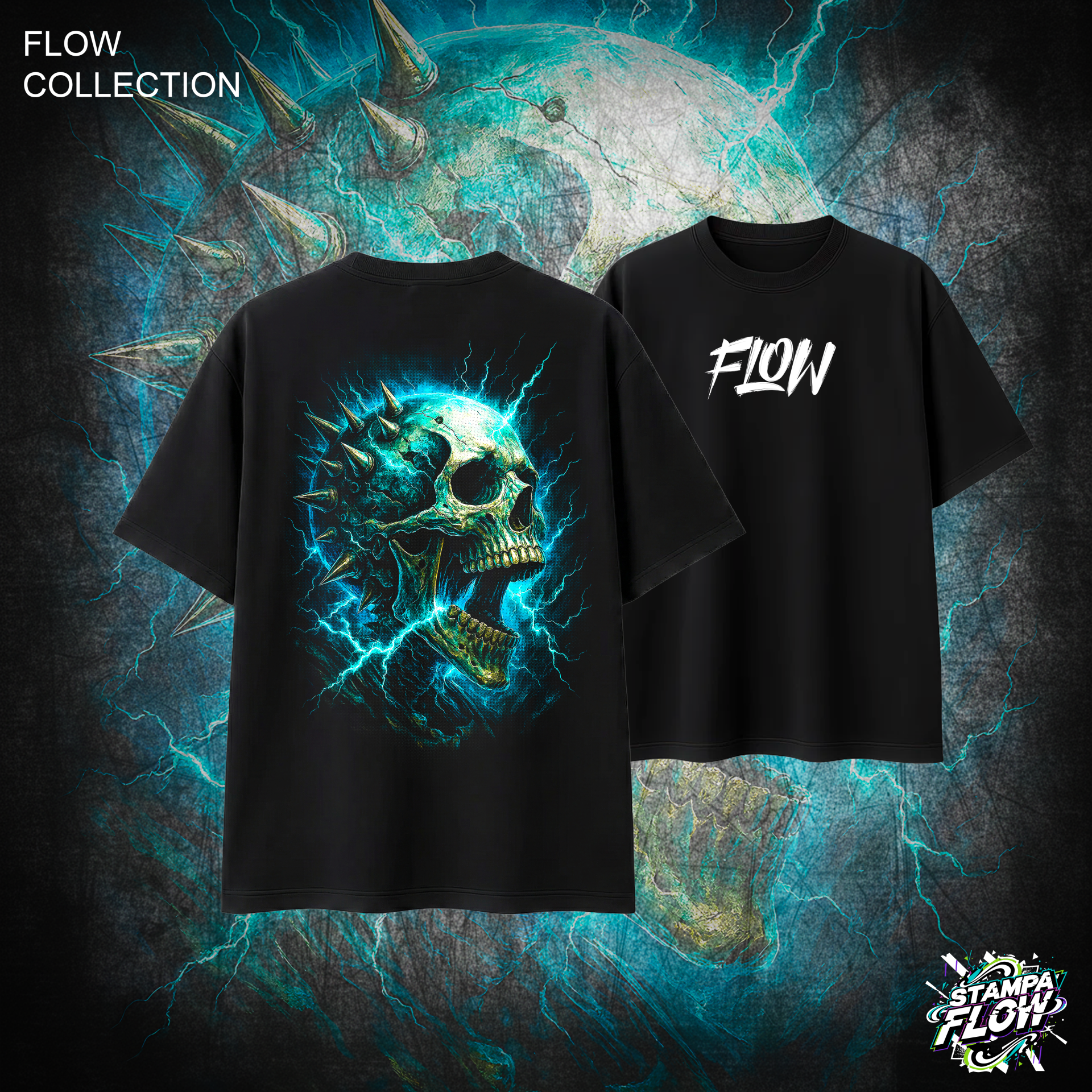 Questa T-shirt domina la scena grazie a una maxi-grafica posteriore ad altissimo impatto: un teschio borchiato travolto da fulmini e scariche neon. I contrasti tra le sfumature elettriche e il nero profondo creano un effetto iper-realistico che vibra ad ogni movimento, perfetto per chi cerca uno stile streetwear estremo e tecnico. Sul petto, il logo FLOW completa il design.