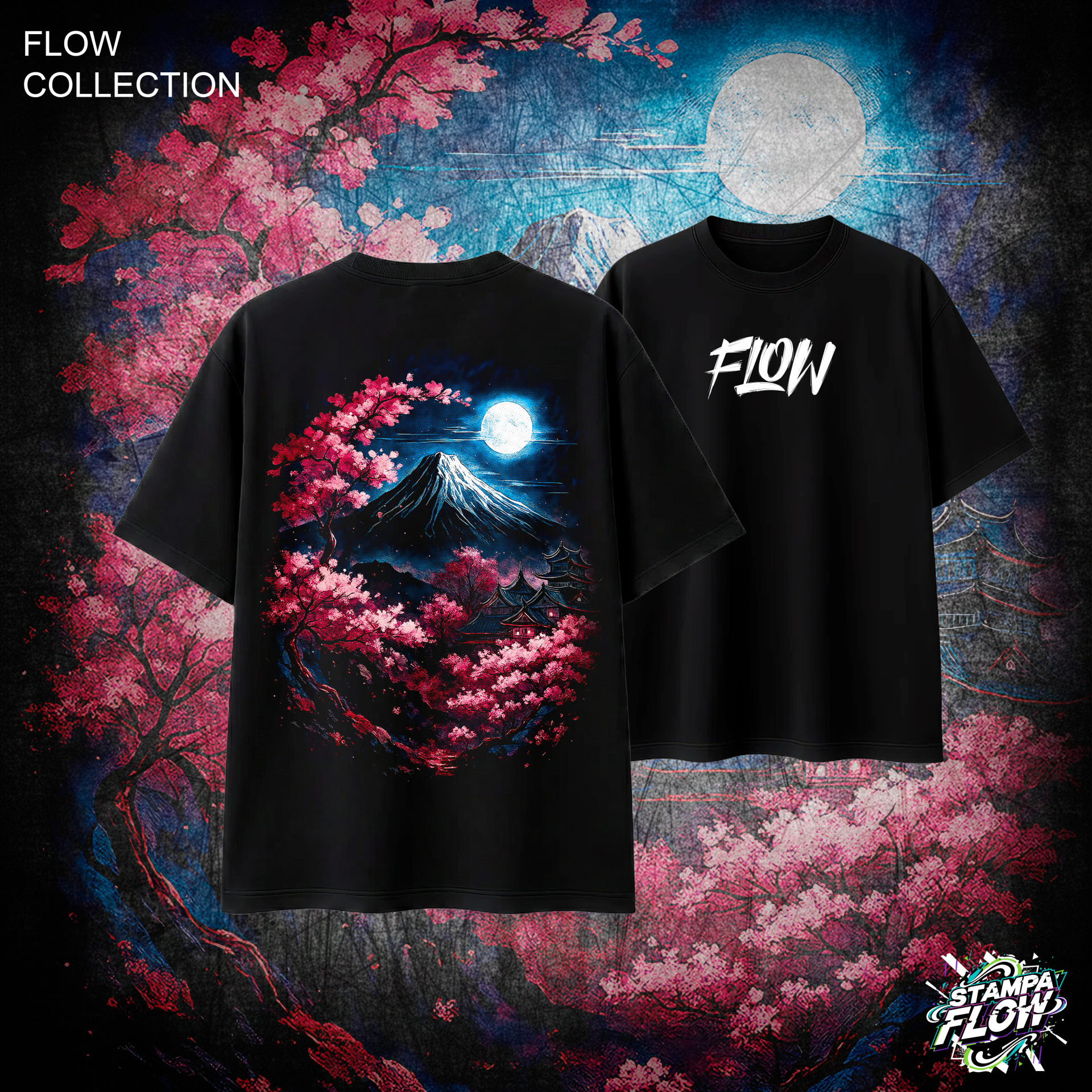 Questa T-shirt fonde la cultura visiva giapponese con le atmosfere metropolitane. La maxi-grafica posteriore evoca una calma profonda: la silhouette iconica del vulcano sacro riposa sotto un bagliore lunare, circondata dall’esplosione cromatica dei fiori di sakura che contrastano magnificamente con i toni blu notte e il nero del tessuto. Un pezzo d’arte da indossare, perfetto per chi cerca uno stile che unisca impatto visivo ed eleganza senza tempo. Sul petto, il logo FLOW completa il design.