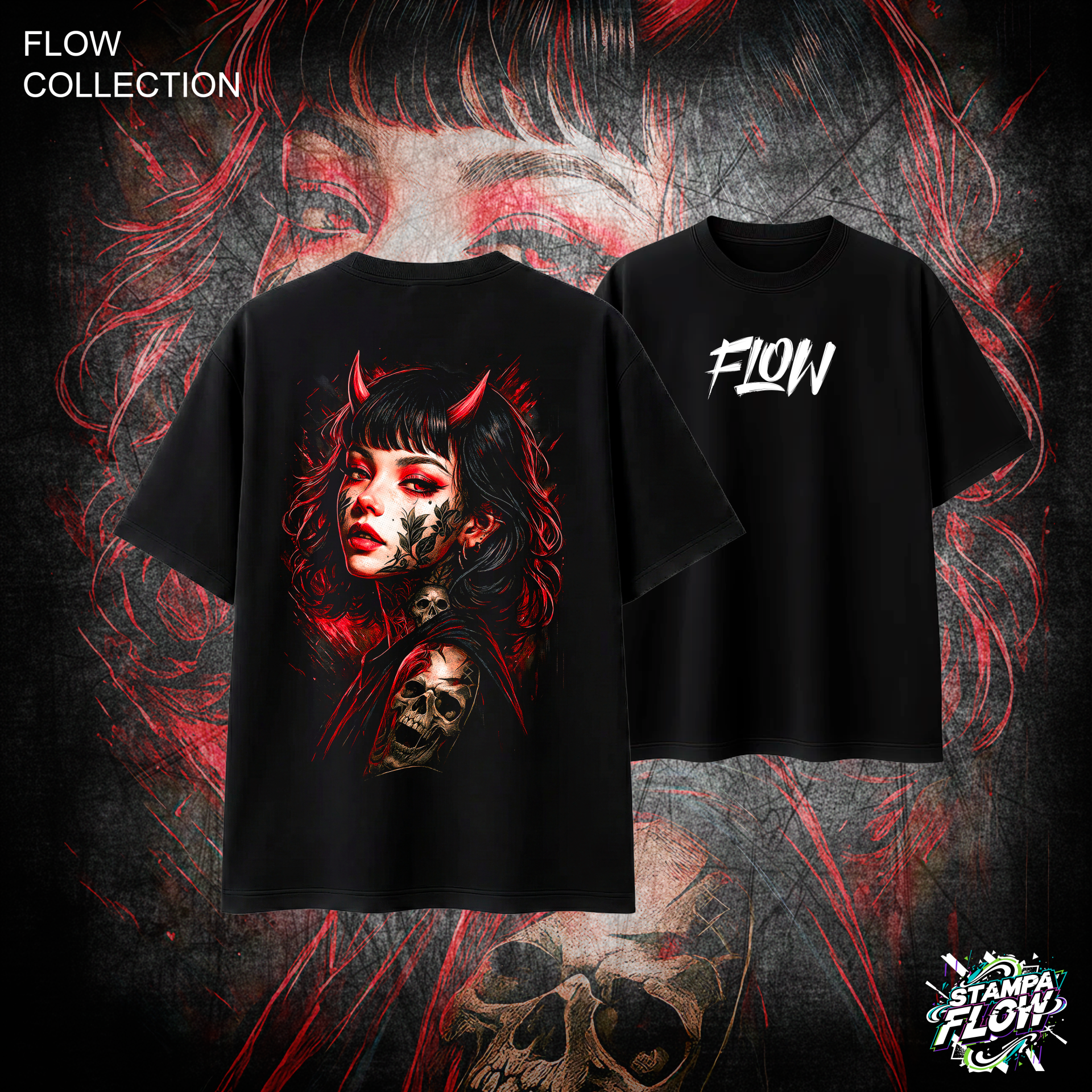 Questa T-shirt domina con un’eleganza macabra e moderna. La maxi-grafica posteriore incanta con lo sguardo freddo e penetrante di una figura femminile demoniaca, in netto contrasto con l’intensità del rosso fuoco e la presenza cupa dei teschi. Il mix tra i tratti manga, i tatuaggi e i bagliori spettrali crea un impatto visivo devastante sul nero profondo del cotone pesante. Un pezzo di puro design streetwear per chi non vuole passare inosservato. Sul petto, il logo FLOW completa il design.