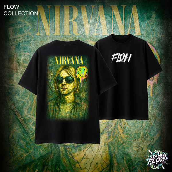 Questa T-shirt trasforma lo spirito del rock alternativo in un pezzo di design streetwear moderno. La maxi-grafica posteriore domina con un ritratto ipnotico, dove le lenti scure degli occhiali riflettono un’aura di mistero e malinconia. Il contrasto tra i colori saturi “acid wash” e il nero del cotone pesante Made in Italy crea un look vintage ma estremamente attuale. Perfetta per chi vuole un outfit che parli di libertà, chitarre distorte e attitudine anticonformista. Sul petto, il logo FLOW completa il design.