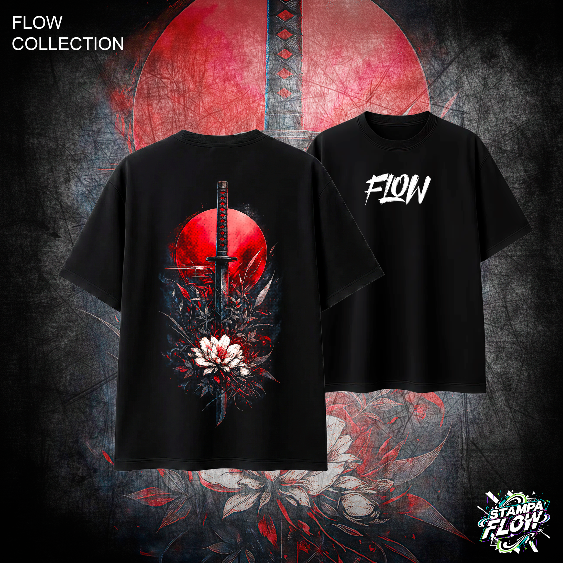 Questa T-shirt incarna la dualità dell’anima del guerriero. La maxi-grafica posteriore attira lo sguardo con una composizione simmetrica e potente: l’elsa di una spada tradizionale si erge fiera, circondata da foglie scure e da un loto bianco puro, mentre un cerchio cremisi infiamma lo sfondo. Un design essenziale ma dal fortissimo impatto visivo, che spicca sul nero del cotone pesante per regalarti un look urban raffinato e senza tempo. Sul petto, il logo FLOW completa il design.