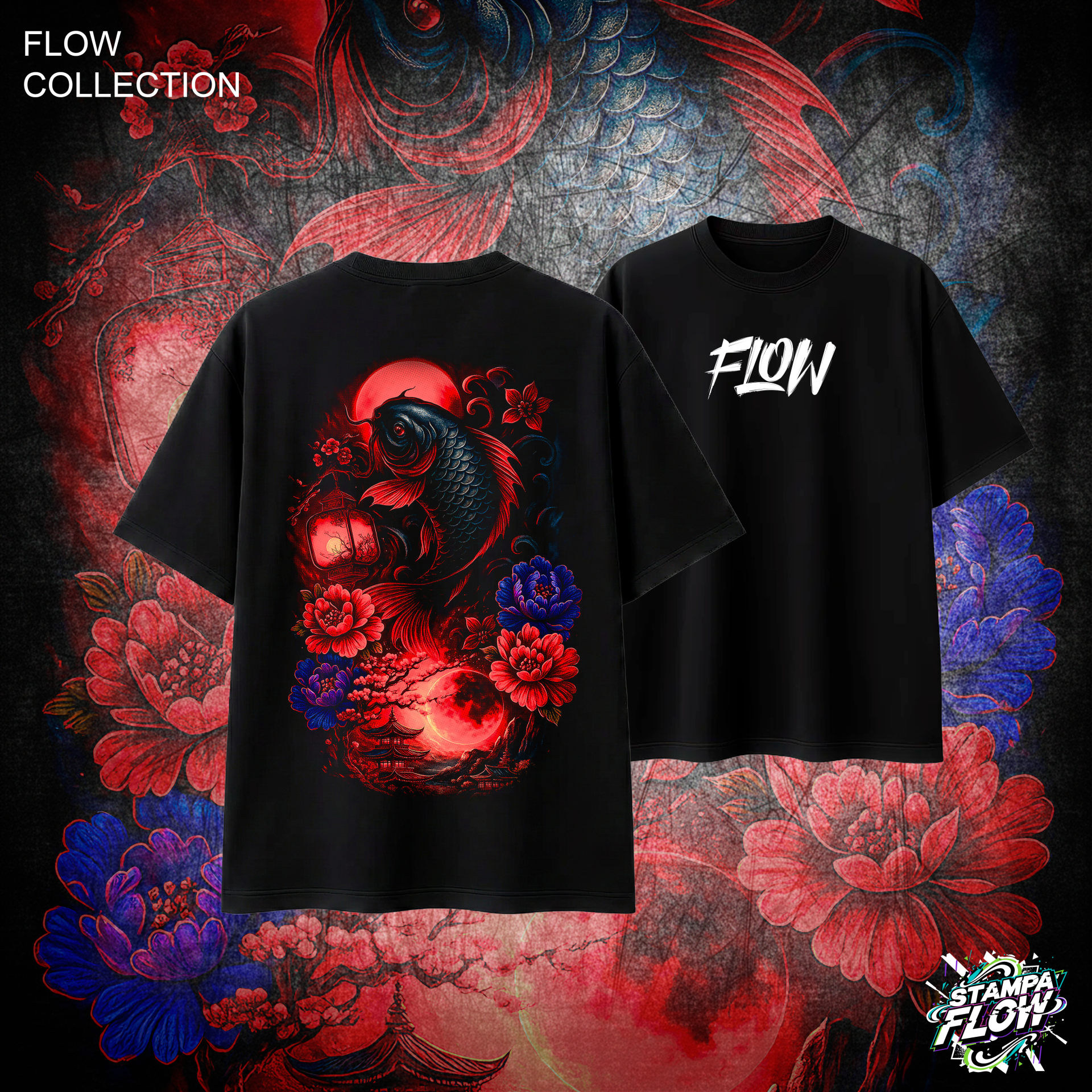 Questa T-shirt trasforma la simbologia asiatica in un pezzo di design dal fascino ipnotico. La maxi-grafica posteriore incanta con il fluire di una carpa scura tra fiori lussureggianti e le sagome di antiche pagode, tutto avvolto in un’atmosfera mistica e notturna. L’equilibrio perfetto tra i rossi intensi, i blu profondi e il nero del cotone pesante rende questa maglia un must-have per chi cerca un look ricercato e ricco di significato. Sul petto, il logo FLOW completa il design.