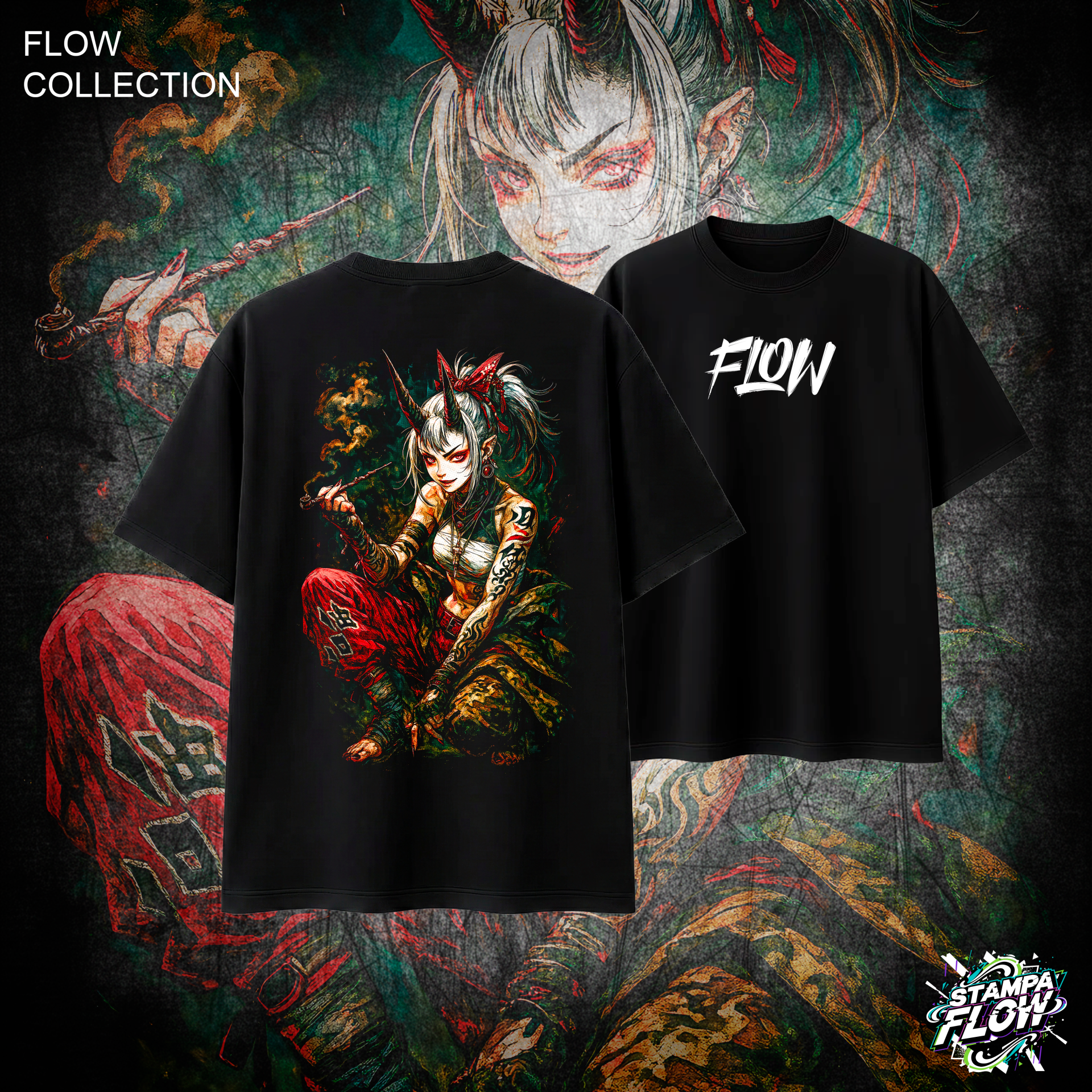 Questa T-shirt unisce l’immaginario anime a una forte attitudine underground. La maxi-grafica posteriore domina la scena con una figura femminile demoniaca dallo sguardo di sfida, arricchita da tatuaggi tradizionali e dettagli in rosso vivo che spiccano in modo esplosivo sul nero profondo del cotone pesante. Un design provocatorio e ad alto impatto visivo, pensato per dominare la strada con un’estetica dark-oriental unica. Sul petto, il logo FLOW completa il design.