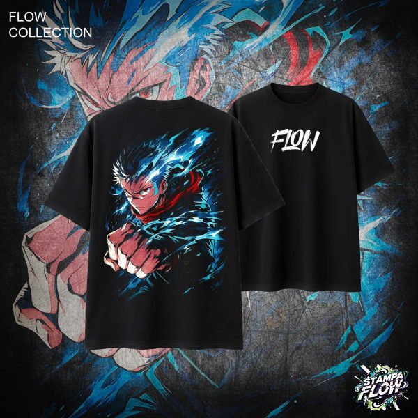 Questa T-shirt porta la forza fisica e spirituale di Yuji Itadori nel tuo outfit. La maxi-grafica posteriore è pura adrenalina: Yuji è pronto a colpire avvolto da un’aura di energia blu elettrico che risalta prepotentemente sul nero, accompagnata dal logo FLOW sul petto.