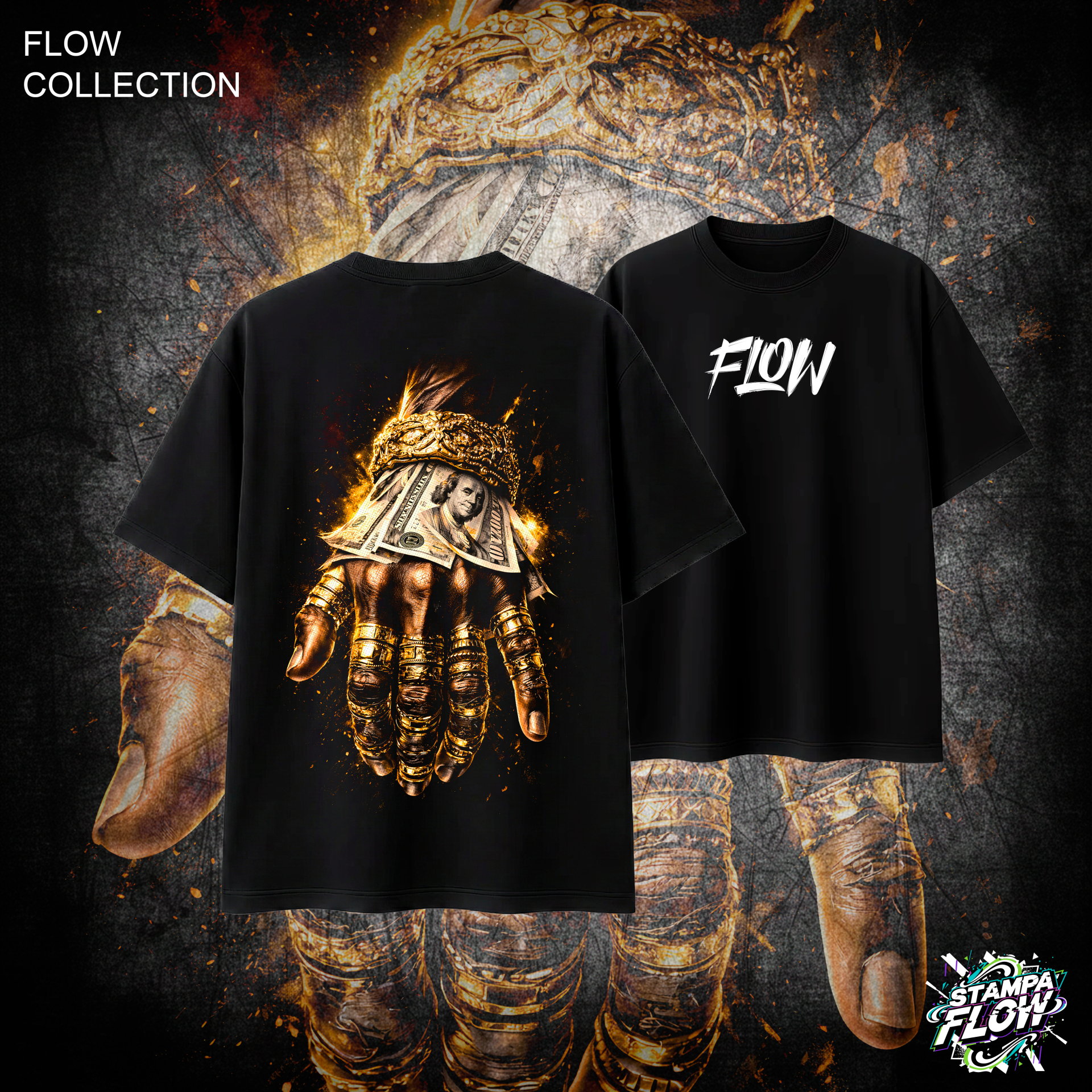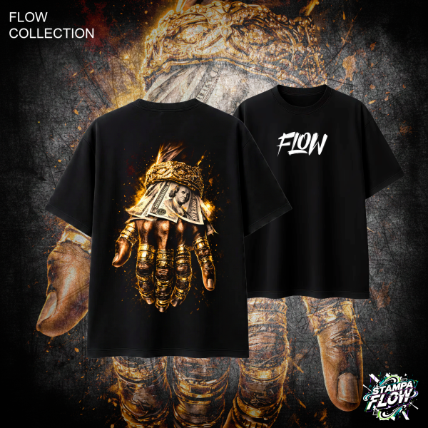 La Flow Collection celebra chi si fa strada da solo, trasformando l’ambizione in oro. Questa T-shirt porta l’estetica del lusso urbano e della cultura del successo direttamente nel tuo guardaroba quotidiano. La maxi-grafica posteriore è magnetica e provocatoria: il bagliore dell’oro puro contrasta con la grana realistica della pelle e il dettaglio inconfondibile dei dollari, il tutto avvolto in un’aura di energia incandescente. Realizzata in cotone pesante Made in Italy con un taglio oversize rilassato, questa maglia è l’emblema di chi punta sempre in alto e vuole un look che lo rispecchi appieno. Sul petto, il logo FLOW completa il design.