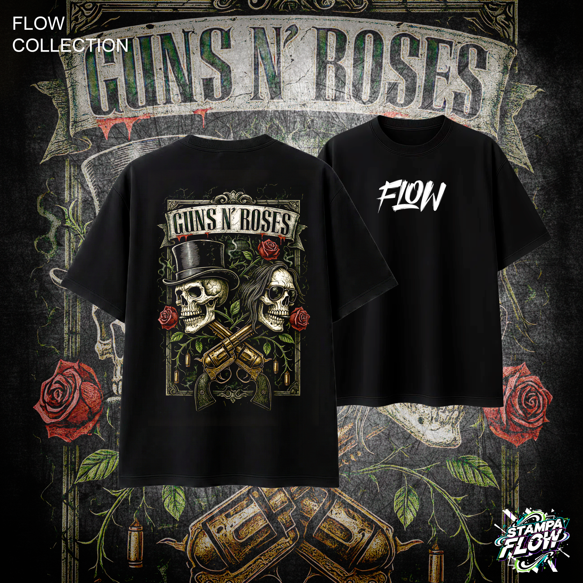 Questa T-shirt porta l’estetica dei tour mondiali direttamente nel tuo stile quotidiano. La maxi-grafica posteriore domina con una composizione simmetrica e potente: l’oro metallico delle pistole incrociate brilla contro il rosso intenso delle rose, mentre i teschi stilizzati aggiungono un’anima graffiante e vissuta. Realizzata in cotone pesante Made in Italy, questa maglia è la scelta definitiva per chi cerca un look vintage-rock filtrato attraverso la lente dello streetwear moderno. Indossala e preparati a salire sul palco della strada. Sul petto, il logo FLOW completa il design.